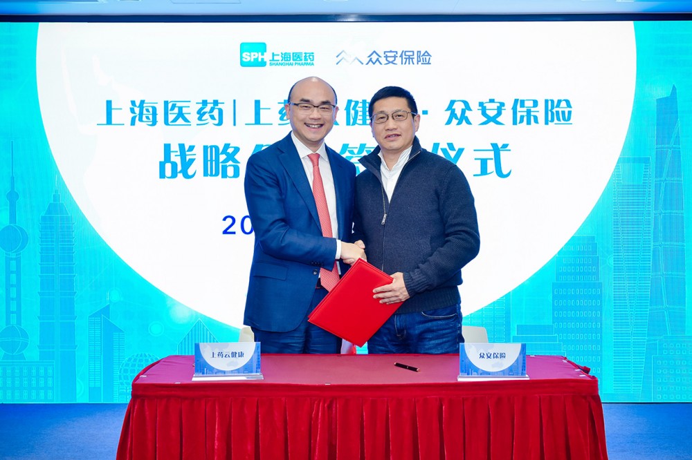 上海醫(yī)藥執(zhí)行董事,上藥控股總經(jīng)理李永忠同眾安保險(xiǎn)CEO,眾安保險(xiǎn)金融事業(yè)群總裁陳勁簽署合作協(xié)議