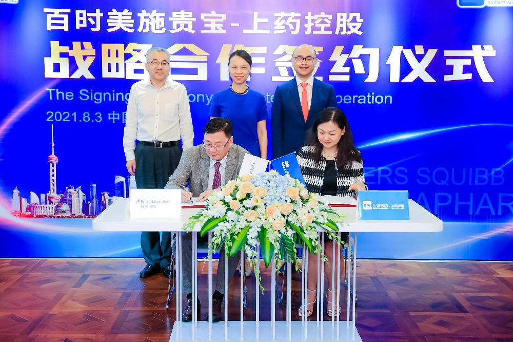 8月3日,在上海自由貿(mào)易試驗(yàn)區(qū)臨港新片區(qū)管委會(huì)專(zhuān)職副主任武偉的見(jiàn)證下,百時(shí)美施貴寶和上藥控股在上海舉行了隆重的戰(zhàn)略合作簽約儀式。百時(shí)美施貴寶中國(guó)大陸及香港地區(qū)總經(jīng)理陳思淵、高級(jí)副總裁及成熟產(chǎn)品業(yè)務(wù)及商業(yè)運(yùn)作管理負(fù)責(zé)人傅旭東、副總裁及中國(guó)和亞洲區(qū)財(cái)務(wù)部兼行政部負(fù)責(zé)人李平及施貴寶管理團(tuán)隊(duì);上海醫(yī)藥執(zhí)行董事、副總裁、上藥控股總經(jīng)理李永忠,上藥控股副總經(jīng)理宋潞潞等共同參與簽約儀式。