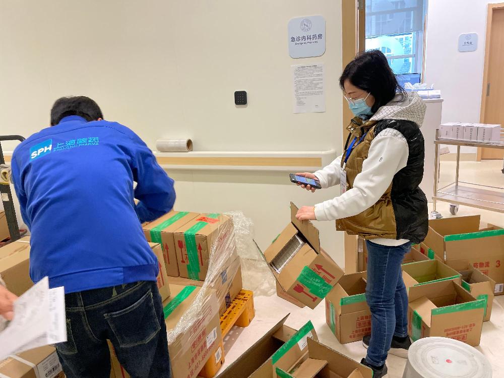 上藥醫(yī)療器械黨總支劉唯清、施曉攜手SPD團隊,一同擔負起全院約1000張床位和醫(yī)務(wù)人員的保供需求,從上午9點到晚上10點,口罩、防護服、消毒酒精……前方缺什么,他們便第一時間補上。