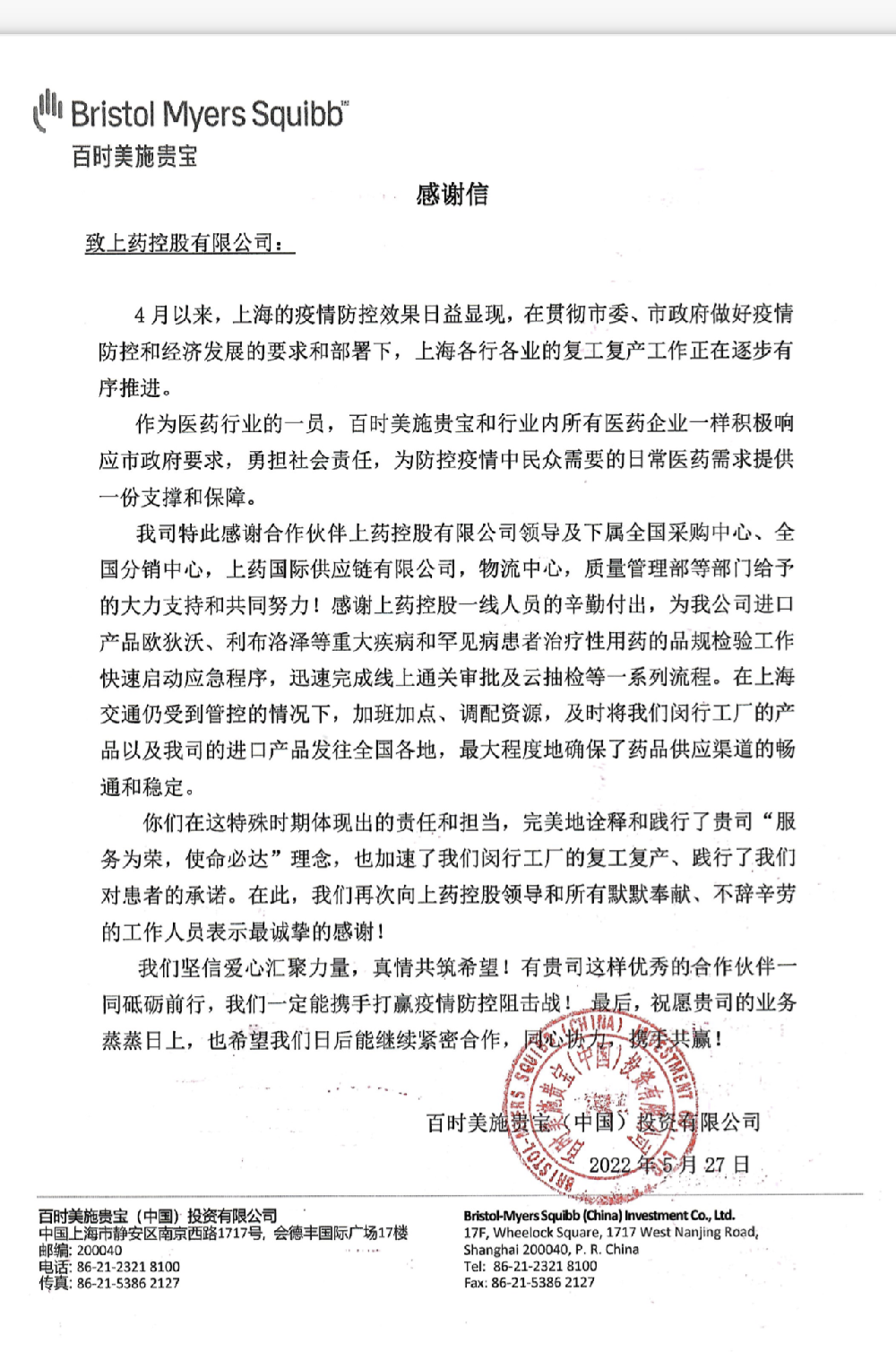 “感謝上藥控股,感謝你們?cè)谔厥鈺r(shí)期體現(xiàn)的責(zé)任和擔(dān)當(dāng),加快國(guó)內(nèi)急需藥品的快速上市,踐行了施貴寶對(duì)患者的承諾!”手握疫情封控以來(lái)獲取的最新兩份藥檢報(bào)告,百時(shí)美施貴寶高級(jí)副總裁傅旭東激動(dòng)地說(shuō)道。5月27日,上藥控股收到百時(shí)美施貴寶發(fā)來(lái)的感謝信,對(duì)上藥控股全力克服疫情期間交通管控等重重困難,圓滿完成歐狄沃?和利布洛澤?的清關(guān)、藥檢任務(wù),確保進(jìn)口藥品供應(yīng)渠道的暢通和穩(wěn)定表示感謝。