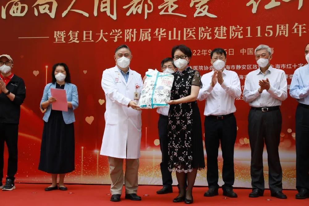 華山醫(yī)院黨委鄒和建書記代表承辦單位進(jìn)行致謝,表示將持之以恒把保障人民群眾健康放在第一位,不斷提升健康服務(wù)能力、豐富服務(wù)內(nèi)涵,努力為市民健康素養(yǎng)的提升打造更高質(zhì)量的健康公益服務(wù)項(xiàng)目。鄒書記并代表復(fù)旦上醫(yī)援瓊醫(yī)療隊(duì),將一件全體醫(yī)療隊(duì)員簽名的防護(hù)服作為上醫(yī)95年周年生日祝福贈予復(fù)旦大學(xué)上海醫(yī)學(xué)院,醫(yī)學(xué)院黨委張艷萍副書記代表接受。
